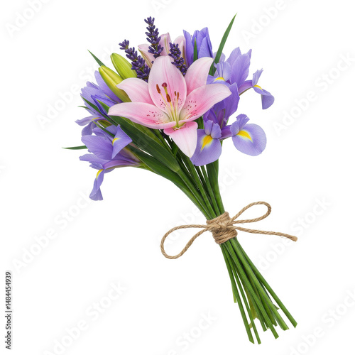 Charming bouquet of purple irises, pink lily, lavender tied with rustic twine on black background