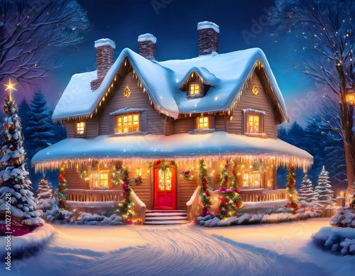 Charming Christmas House Painting with Snowy Roof, Colorful Lights, and Festive Decorations