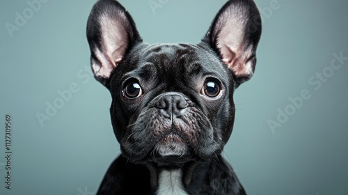 Charming close-up of a French Bulldog with expressive eyes against a serene backdrop in a professional studio setting.