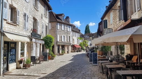 street, village, cobbled, architecture, building, blue skies, tree, peaceful, rustic, france, vacation, travel, tour tourism, summer, sunlight, small town, leisure, scenic, historical, road, alleyway, shop, destination, cultural, vibrant, picturesque, cosy, terrace, paseo, neighbourhood, bakery, relaxation, sunny day, heritage, inviting, countryside, ambience, calmness, daytime, landscape, exploration