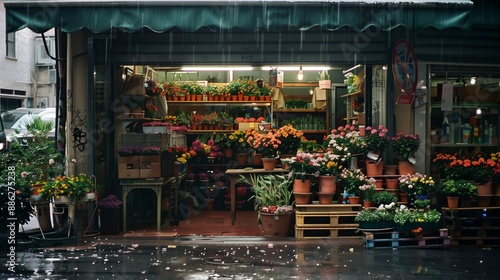 flower, shop, rain, urban, colourful, plant, potted, street, city, floral, vibrant, cosy, bloom, gardening, retail, market, wet, window, sidewalk, flower petals, bouquet, decorative, nature, horticulture, landscape, environment, greenery, arrangement, blossom, pot, boutique, business, moist, local, neighbourhood, rainy day, beauty, exterior
