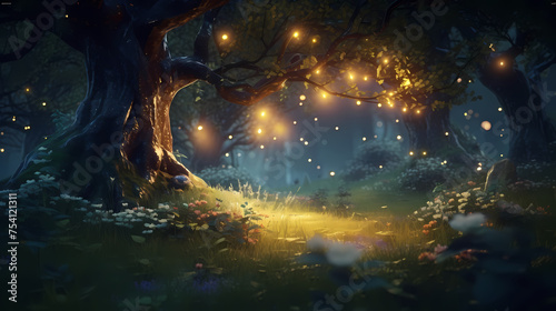 glowing, tree, forest, mysterious, gold, yellow, twilight, night, brilliant, flower, light, fantasy, fairy tale, starlight, wonderland, sunlight, illustration, background, concept, blank, blank space, digital artwork, abstract, scene, poster, business, vector, wallpaper, banner, copy space, texture, closeup, advertising, template, topview