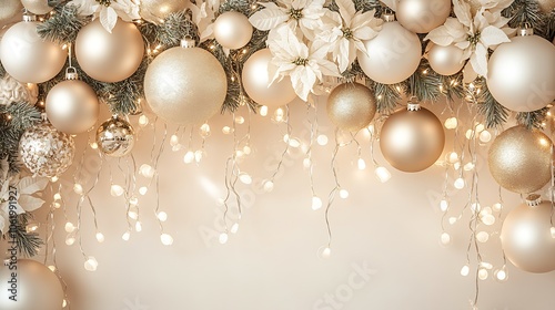 Charming gold Christmas ornaments and pine garland with sparkling lights : Generative AI