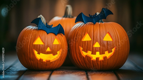 Charming Halloween Pumpkins with Bat Decorations Illuminating a Cozy Autumn Scene for Seasonal Celebrations and Festive Decor Inspiration