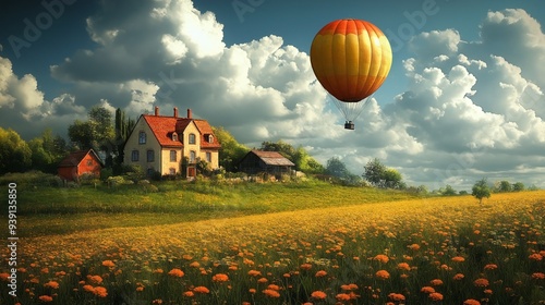 Charming Hot Air Balloon Scenic Landscape Vibrant Flowers Country House Sky