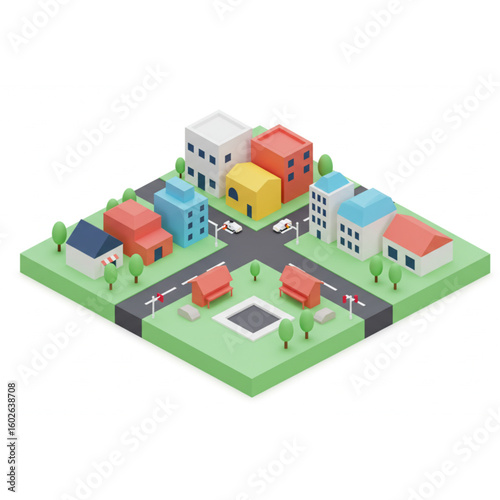 Charming isometric cityscape with colorful buildings and trees, perfect for urban planning concepts