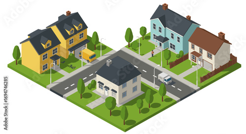 isometric, neighbourhood, house, colourful, vehicle, street, tree, urban, residential, community, architecture, home, design, suburb, town, building, family, green, environment, road, landscape, tranquil, peaceful, grass, window, door, modern, clean, light, cosy, vibrant, picturesque, street light, intersection, parked, garage, fence, sidewalk, driveway, corner