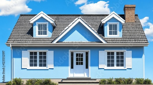 house, home, blue, light, blue house, suburban, dwelling, residence, building, architecture, real estate, property, exterior, facades, shutter, white, window, dormer, roof, grey, chimney, brick, sky, cloud, sunny, day, landscaping, front, door, step, small, cosy, charming, attractive, style, design, residential, family, neighbourhood, community, peaceful, tranquil, simple, elegant, picturesque, honed, dream, aspiration, haven