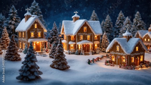 Charming miniature houses nestled in a snowy landscape, each adorned with tiny Christmas trees, creating a cozy winter wonderland scene