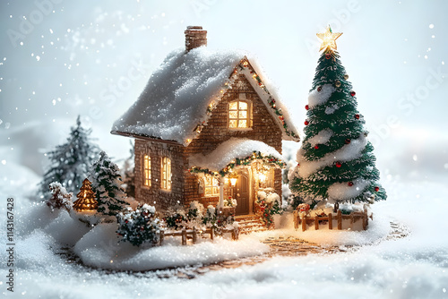 Charming miniature snow-covered house with festive decorations and a Christmas tree, ideal for holiday-themed decorations and displays.