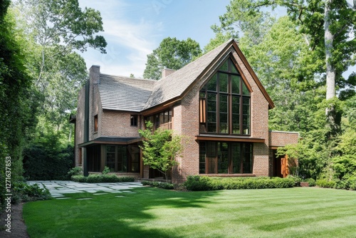 Charming modern brick house surrounded by lush greenery in a serene residential area featuring large windows and an inviting front yard