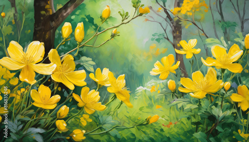 Charming oil painting of yellow flowers at spring. Beautiful nature. Fairy tale forest. Hand drawn