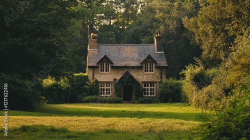Charming old cottage nestled in lush greenery surrounded by trees with ample Copy Space for text placement