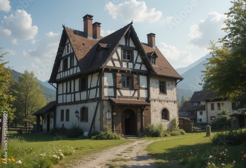 house, historic, rural, architecture, mountain, greenery, sunny, nature, landscape, home, garden, charming, traditional, tranquil, outdoors, scenic, old, countryside, sky, tree, pathway, building, residential, structure, peaceful, rustic, environment, flora, sunlight, beauty, picturesque, park, european, village, wooden