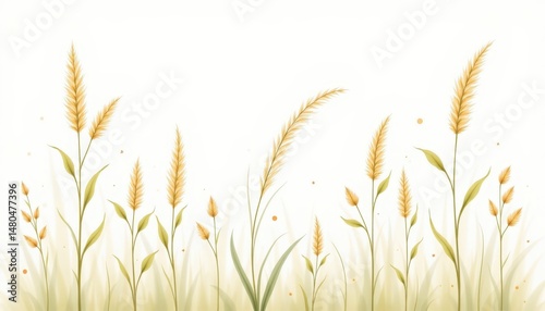 charming ornamental grasses in an illustrative style, using wheat and olive palette, gentle curves, textured leaves, calm atmosphere, high resolution
