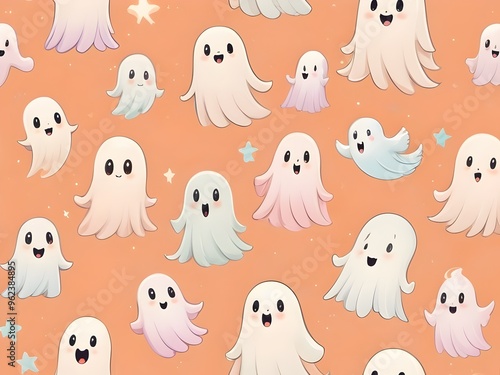 charming pastel ghosts floating on a soft orange background