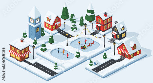 winter, village, scene, isometric, charming, festive, decoration, iceskating, rink, people, snow, covered, building, house, tree, snowy, christmas, holiday, season, cold, weather, activity, recreation, town, street, light, lamp, bridge, clock-tower, sleigh, reindeer, fun, leisure, cosy, cute, illustration, design, artwork