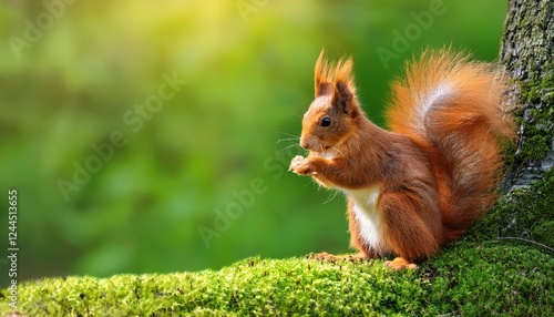 Charming Red Squirrel Nibbling on a Nut amidst Lush Spring Greenery in a Forest, Capturing Playful Energy and the Vibrancy of Natures Awakening.