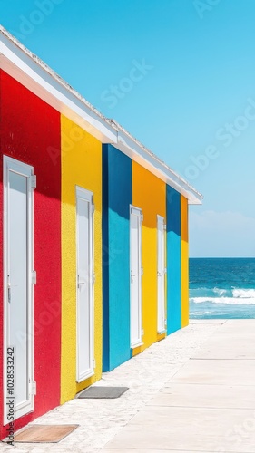 Charming row of colorful seaside cottages in vibrant shades of blue along the coast.