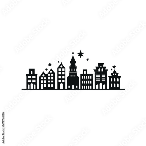 Charming silhouette of european city buildings with festive stars