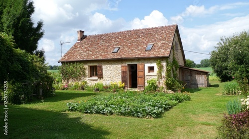 nature, cloud, vegetable, rustic, beautiful, stone, plant, countryside, charming, sky, country, farm, sunny, exterior, homestead, tree, vintage, landscape, garden, quiet, house, rural, bungalow, traditional, simple, grass, old, farmhouse, cosy, flower, peaceful, idylli, summer