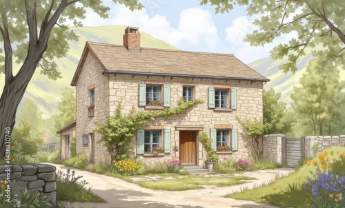 Charming stone cottage surrounded by lush greenery and colorful flowers.