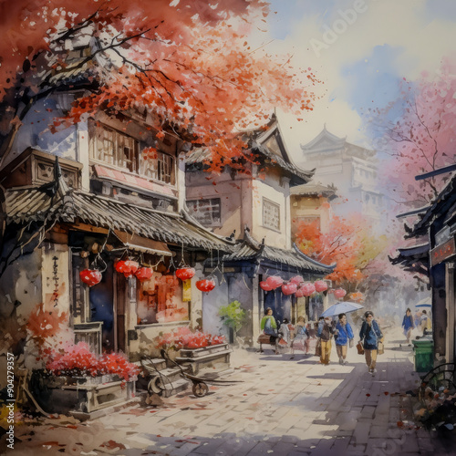 Charming traditional Asian street adorned with red lanterns and vibrant autumn foliage featuring people strolling and enjoying the picturesque scenery