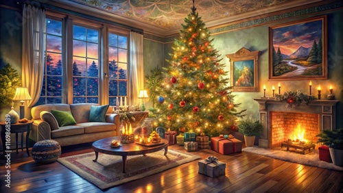christmas tree, watercolor, living room, aerial view, festive, home decor, christmas lights, winter, cosy, warm, inviting, christmas, holiday, festive season, home interior, interior design, sparkling, bright, beautiful, magical, winter landscape, holiday spirit, family, celebration, happy holiday, merry christmas, seasonal, decoration, ornament, present, gift, fireplace, comfort