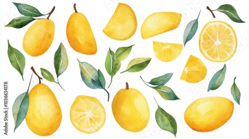 Charming watercolor clipart of mangoes, including whole fruits, slices, and accompanying green leaves. Isolated on a white background, ideal for use in culinary and botanical projects.