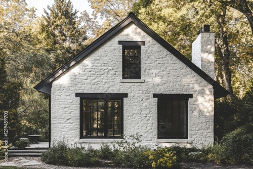 Charming white cottage nestled in lush greenery surrounded by trees in a serene setting offering a peaceful retreat in the early morning light