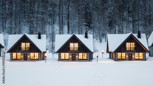 Charming winter houses with snow-covered roofs, illuminated windows amidst a serene forest background.