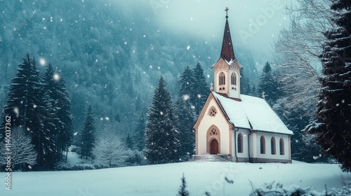 Charming winter scene of a snow-covered church nestled in a serene landscape surrounded by trees and mountains in a tranquil atmosphere.