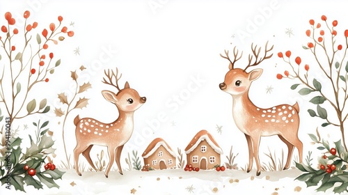 Charming Winter Wonderland Illustration with Cute Deer and Cozy Houses Amidst Snowy Landscape and Festive Foliage