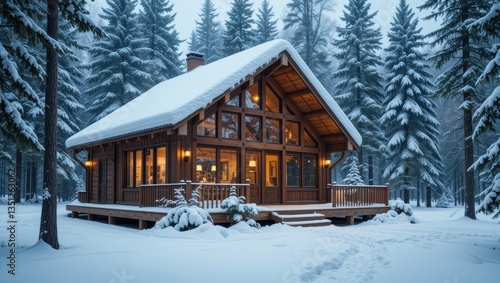 Charming Wooden Cabin Nestled in a Snowy Forest Landscape During Winter Evening