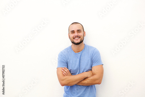adult, arms crossed, attractive, background, beard, blue, carefree, casual attire, caucasian, charming, cheerful, confidence, cool, cute, enjoying, expression, face, fashion, fashionable, guy, hair, photogenic, happiness, happy, hispanic, latin, laughing, leisure, lifestyle, looking, male, man, model, modern, natural, 1, people, person, portrait, relaxed, shirt, short, smiling, standing, style, trendy, wall, white, young