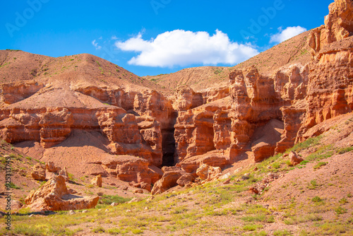 Charyn Canyon, Valley of Castles. The excellence of Kazakhstan. Panorama of natural unusual landscape. The red canyon of extraordinary beauty looks like a Martian landscape.