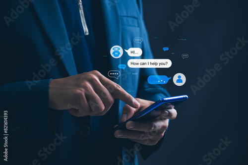 Chatbot Artificial Intelligence, Businessman using AI Chatbot for Innovative Solutions in a Modern Office, Embracing Digital Transformation and Business Growth in the Tech Industry.