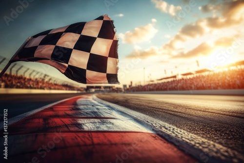 Checkered flag waving on race track at sunset, surrounded by spectators, creating an atmosphere of excitement and anticipation