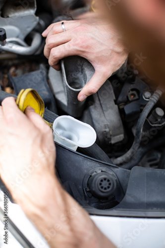 Checking and refilling fluid levels in the car. Vehicle check-up. Under the hood of a car view.