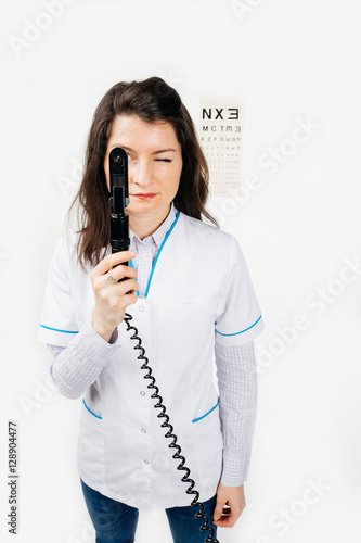 woman, patient, doctor, medicine, optometry, vision, eye, care, health, equipment, tool, specialist, profession, checking, looking, standing, isolated, serious, concentrated, distance, dioptre, carefree, holding, chart, letter