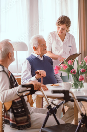 nursing home, patient, health, check, nurse, young, man, woman, wheelchair, walker, disorder, caregiver, take care, living room, smile, happy, alzheimer, treatment, afternoon, hospital, medicine, help, support, friends, friendship, grandfather