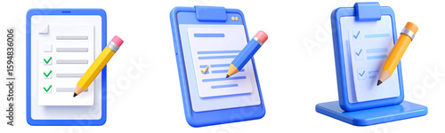 Checklist clipboard document pencil blue 3D illustration survey task office paper organization planning reminder note business education assessment writing stationery productivity management form