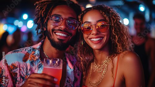 cheerful 25-years-old man and a 20-years-old woman with a small glass of red liquid in hand. They are celebrating at a party