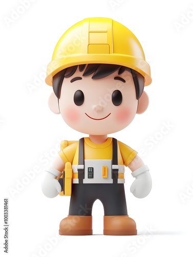 Cheerful 3D network engineer character in yellow uniform and safety helmet,smiling with a confident and friendly expression,on a bright white background. This could represent an IT professional.