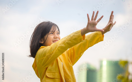 Cheerful A little girl blowing soap bubbles in the park, Kids playing concept