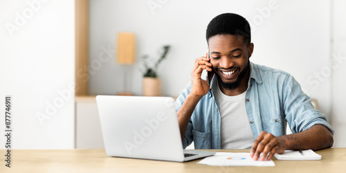 Cheerful african businessman checking financial reports and talking on phone, happy about results of his company. Copy space