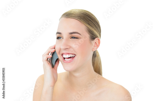 young adult, woman, female, caucasian, looking away, white background, attractive, beautiful, beauty, care, clean, cute, cosmetic, elegance, fresh, freshness, model, natural, honed, pretty, purity, pure, gorgeous, shoulder, skin, wellness, fair hair, blond, light hair, posing, cut-out, isolated, holding, communication, device, calling, on the phone, phoning, phone call, smartphone, mobile phone, wireless technology, phone, happy, smiling, cheerful, naked, naked, bare