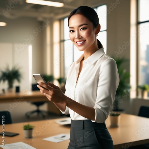 Cheerful beautiful Asian woman holding smartphone in the office workplace,