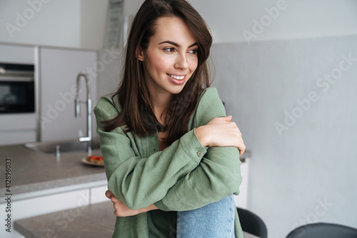 woman, people, girl, kitchen, indoor, posing, looking, sitting, smiling, joyful, cheerful, happy, pleased, young, caucasian, brunette