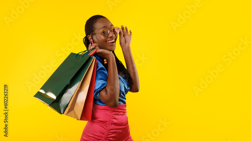 Cheerful Black Lady With Shopping Bags Wearing Sunglasses, Yellow Background